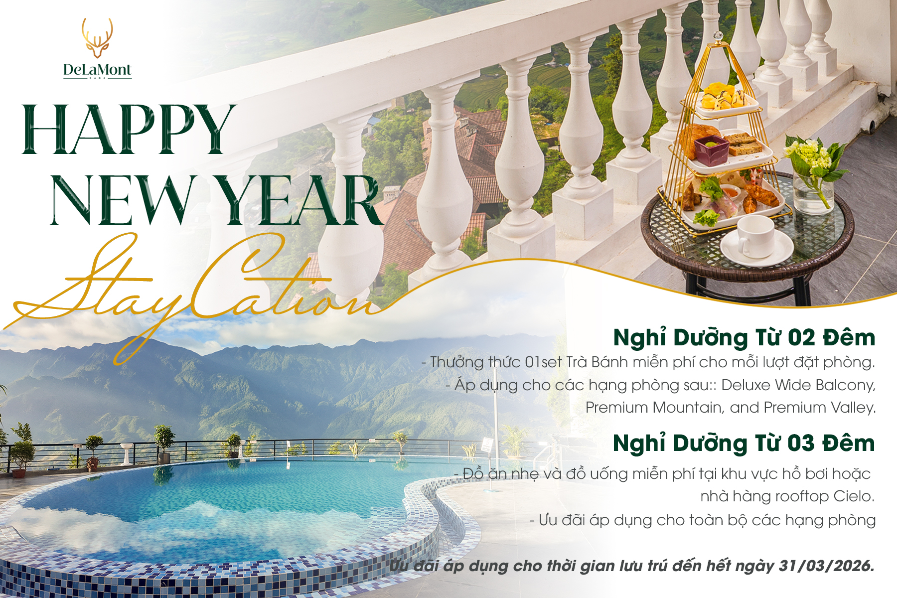 Tọa lạc tại thị trấn Sa Pa, khách sạn DeLaMont Sapa là lựa chọn lý tưởng để khám phá vẻ đẹp thiên nhiên và văn hóa bản địa. Khách sạn 4 sao boutique với 45 phòng nghỉ tiện nghi, nhà hàng, quầy bar, phòng gym và bể bơi ngoài trời sẽ mang đến trải nghiệm nghỉ dưỡng trọn vẹn giữa không gian núi rừng thơ mộng.