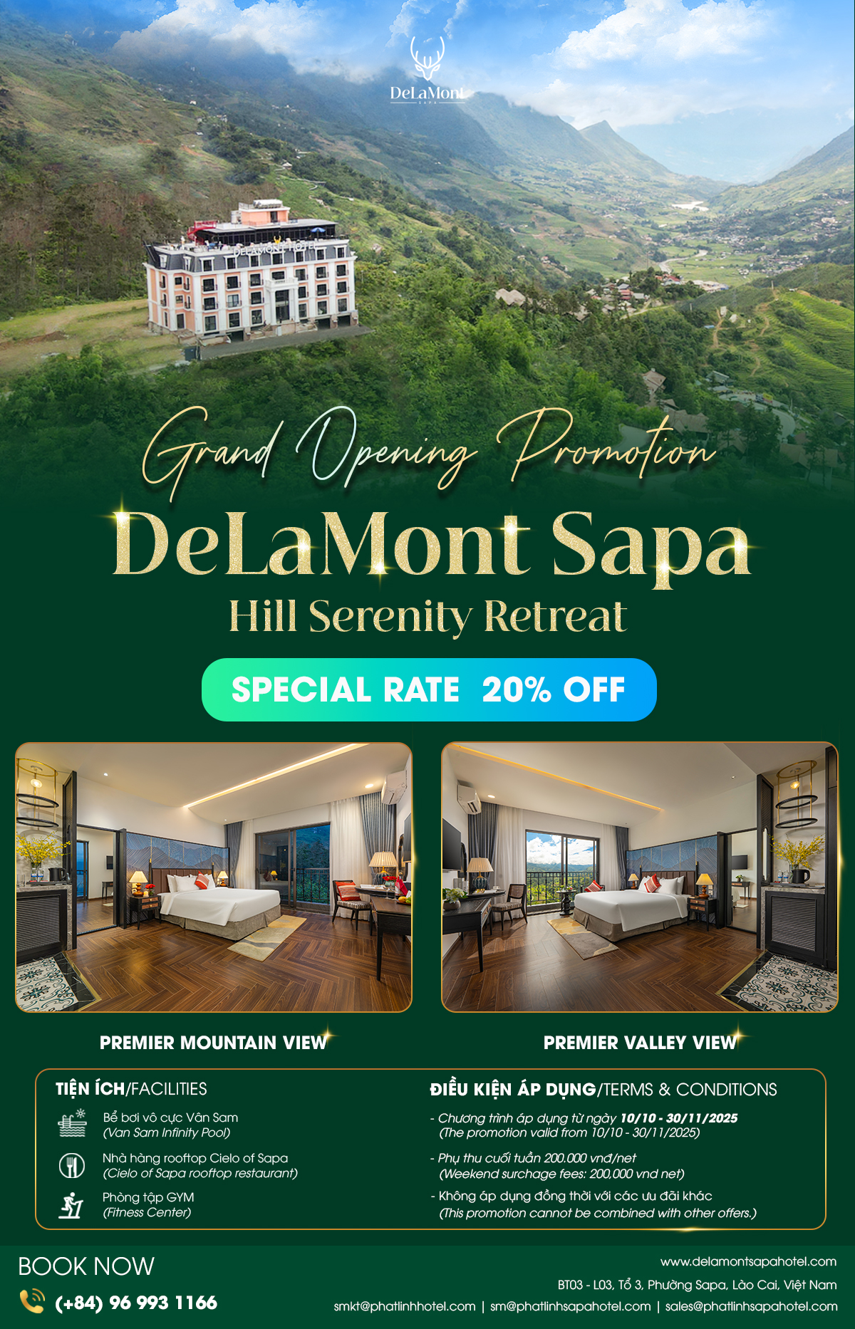 To celebrate our grand opening, DeLaMont Sapa Hotel offers 20% discount for the first bookings made from October 10 – November 30, 2025.